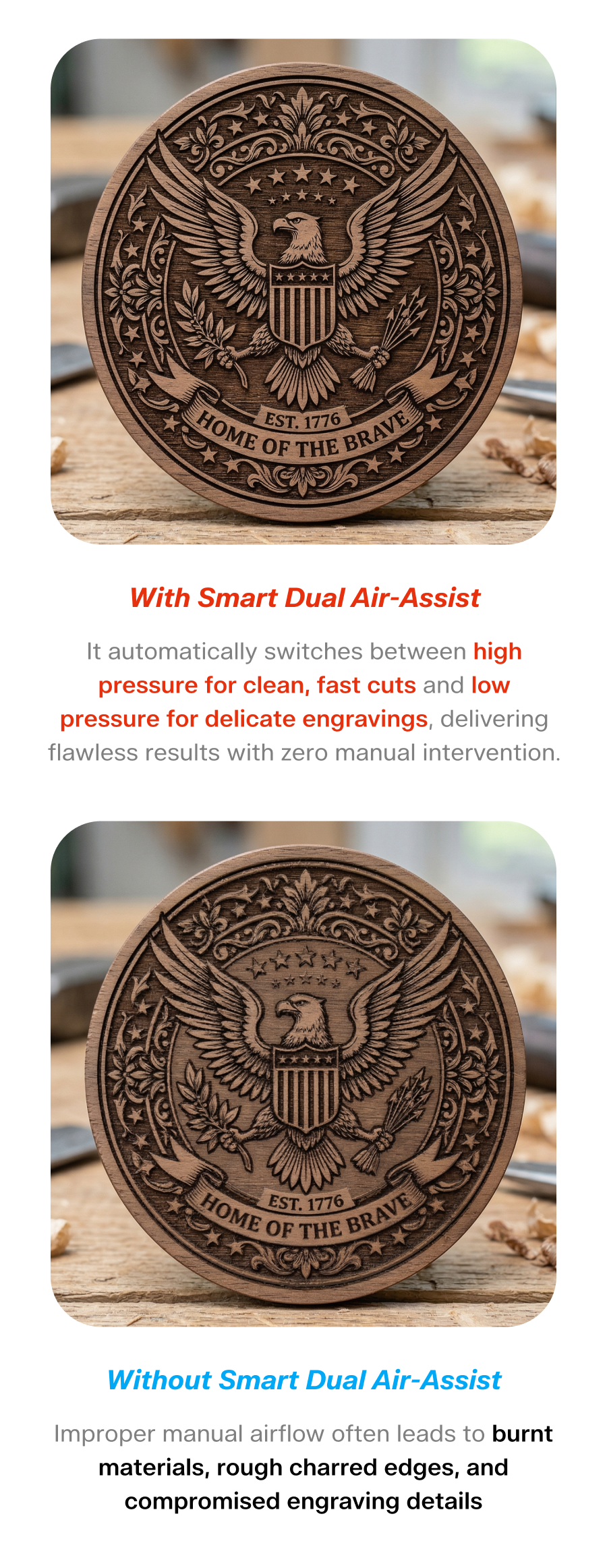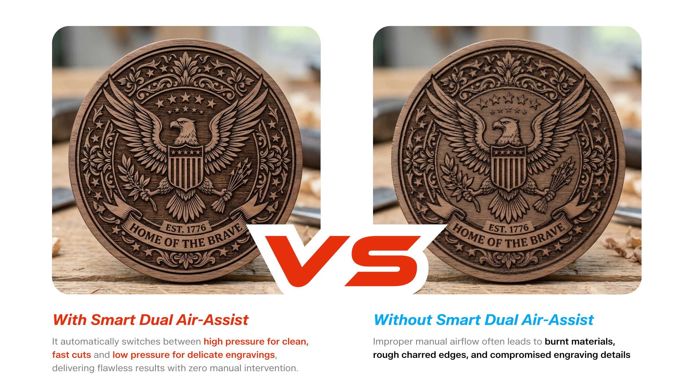 ✔ Smart Dual Air Assist – Automatically switches airflow for cutting and engraving, delivering cleaner results with zero manual adjustment.
